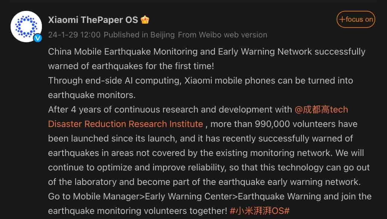 Xiaomi China Mobile Earthquake Monitoring and Early Warning Network Successful