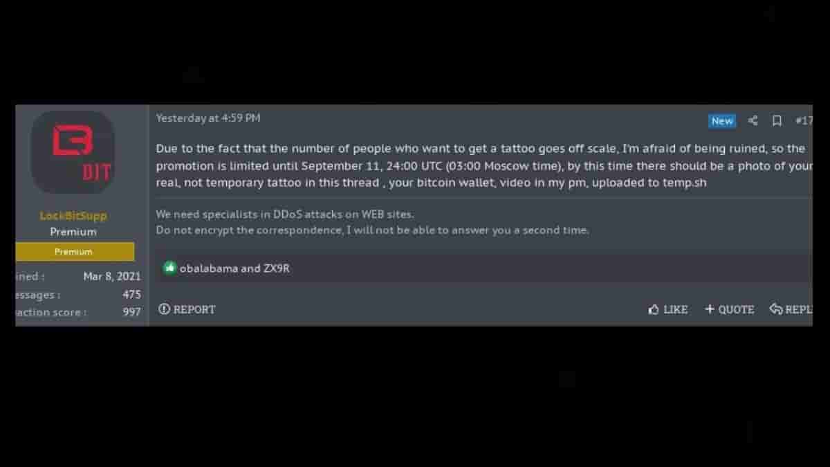 LockBit ransomware group announced via social media that they will be awarding $1,000 to individuals who tattooed the LockBit ransomware group logo on their body. When the news broke, it created a far too chaotic environment among people on social media. LockBit’s payouts ended on September 11th. Currently, more than ten people have tattoos of the LockBit logo, including a woman.