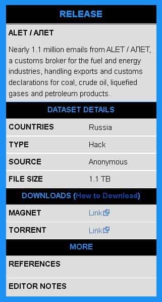 According to the latest revelation, Anonymous has published nearly 1.1 million emails (1.1 TB of data) from ALET / АЛЕТ, a Russian customs broker for companies in the fuel and energy industries, handling exports and customs declarations for coal, crude oil, liquefied gases and petroleum products.