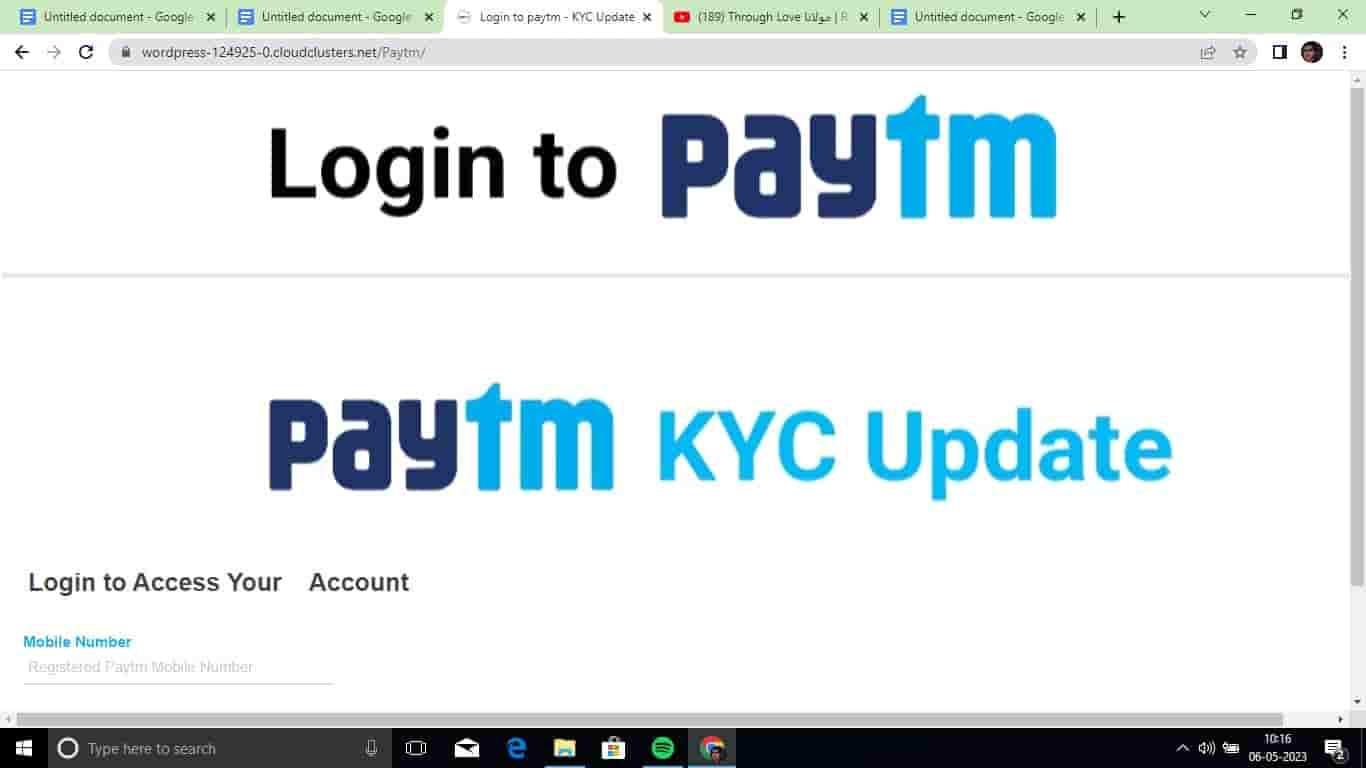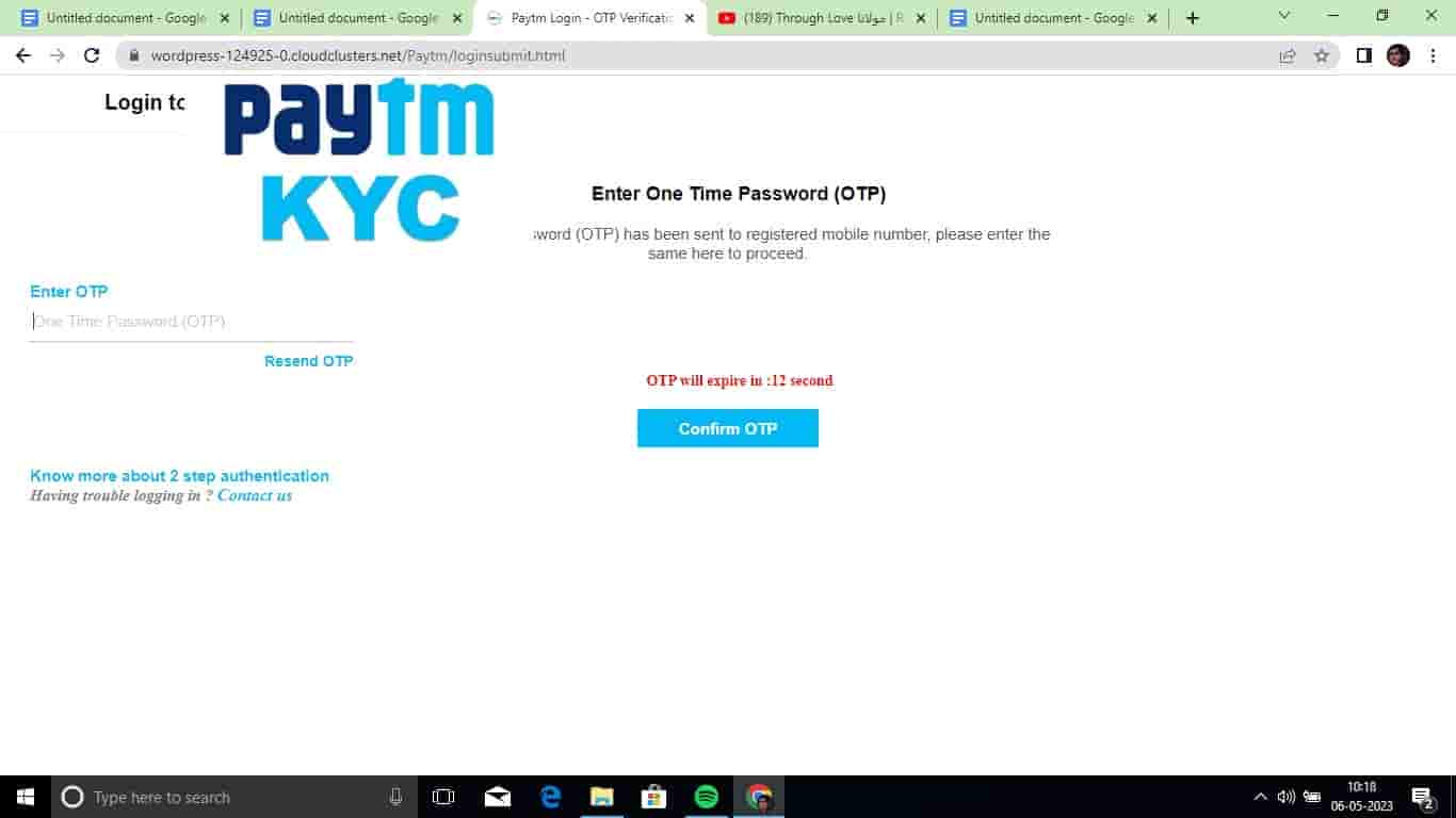 Here you can see that the website has been designed in a way to look like a Paytm website. In the left bottom corner of the screen, you can see the space asking for “Registered Paytm Mobile Number”, a second red flag to look more authentic. We went a step ahead by taking risks to bring out the truth and filled in the phone number which took us to the next screen which asked for the OTP for Paytm KYC. From link to website, everything has been developed to persuade the victim that they are on an authentic site who eventually ends up losing all their money.