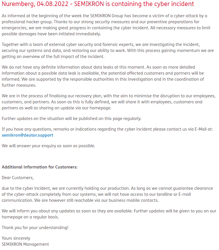 The "cyber incident" announced by the German-based independent manufacturer of power semiconductor components SEMIKRON is a ransomware attack held by #LV group. 2Tb of data allegedly stolen.@ransomwaremap @cyber_etc @ValeryMarchive pic.twitter.com/btrnkMM12x