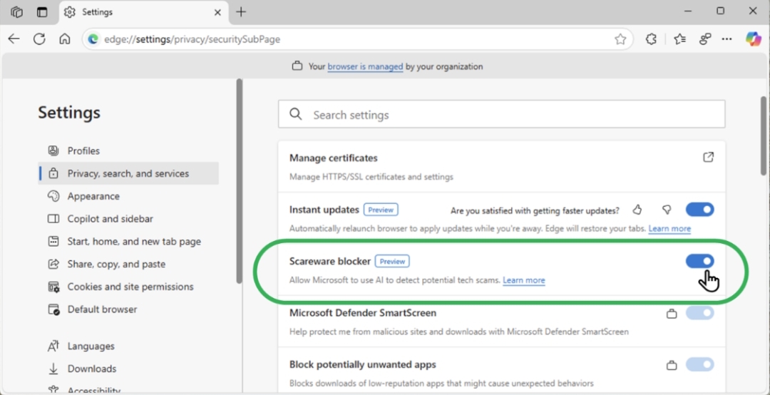 It is rolling out now as a preview for all Edge users on Windows PCs. To enable Edge, first, make sure that previews are allowed by the administrator and also that Edge is fully up to date. After making sure you have the latest updates, you should see the scareware blocker preview listed under Privacy Search and Services.