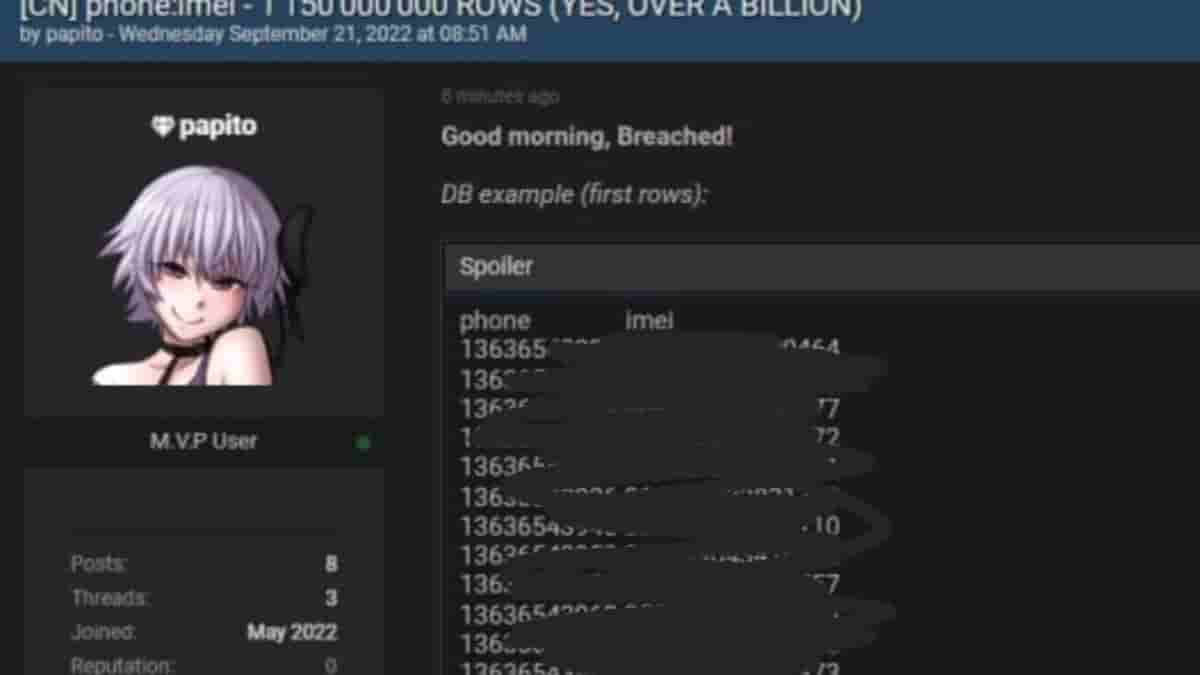 Over 1 billion Chinese phone numbers and IMEI numbers have allegedly been leaked, according to CyberKnow. IMEI stands for “International Mobile Equipment Identity.” It’s a unique number for identifying a device on a mobile network. A user named ‘papito’ leaked the phone numbers and IMEI numbers on Breach Forums on Wednesday, 21st September 2022.