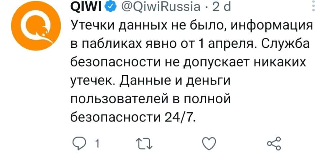 According to a Twitter post by Qiwi, they have stated “There was no data leak, the information in public is clearly dated April 1. The security service does not allow any leaks. Data and money of users are completely safe 24/7” source google translate.