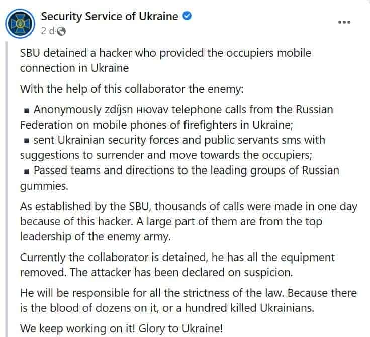 The Ukrainian Security Service (SBU) announced the arrest of a “hacker” who provided technical assistance to invading Russian troops by providing mobile communication services within Ukrainian territory.