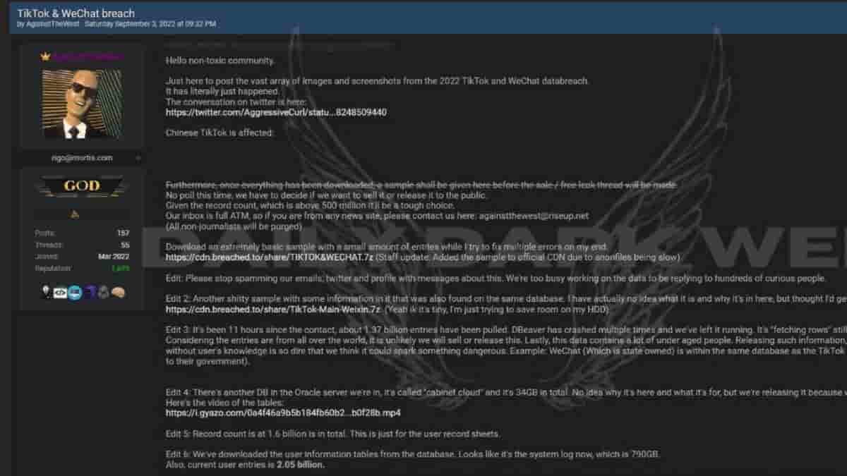 “Who would have guessed that TikTok would decide to store all of their internal backend source code on one Alibaba Cloud instance using a trashy password?” they tweeted, describing how simple it was to download the data. The threat group known as AgainstTheWest claimed to have extracted over 790GB of data. Over 2 billion records have already been extracted by the threat actor. BlueHornet (Against The West) has shared screenshots and data samples to support its claims.