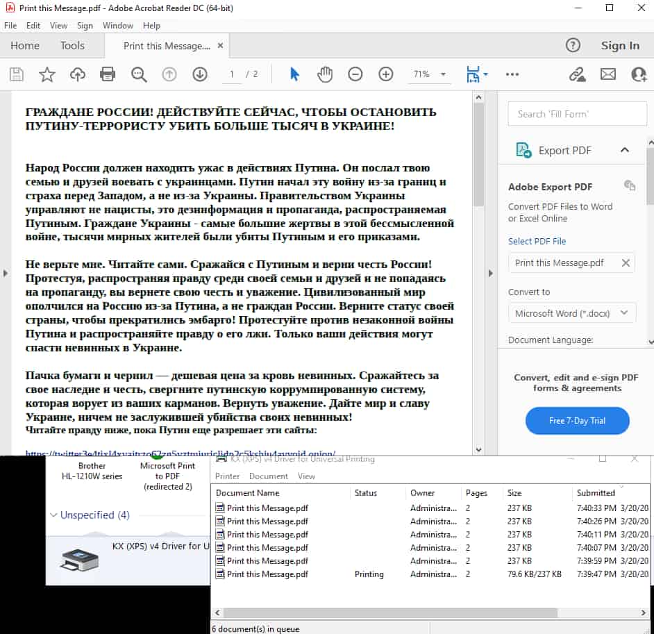 According to Anonymous, the hijacked printers were compelled to print PDFs with a message alerting Russians that “their president, government, and media have all been feeding them lies.”