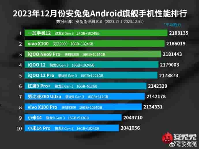 AnTuTu December 2023 Android Flagship and Sub-Flagship Performance List Revealed: OnePlus 12 and Redmi K70E Tops the Charts