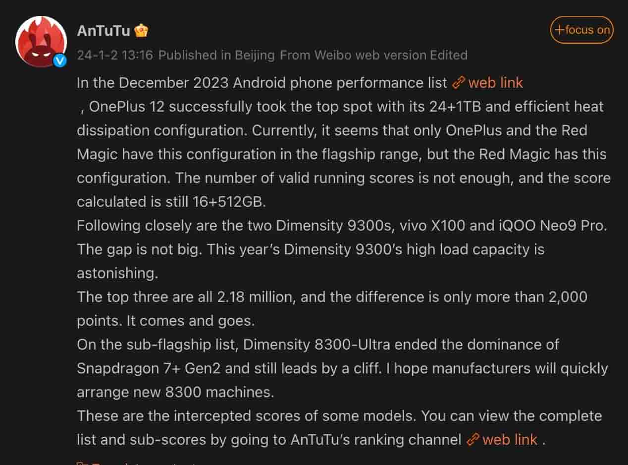 The AnTuTu benchmark platform’s top Android flagship and sub-flagship performance list of December 2023 has been officially shared on Weibo. The latest OnePlus 12 flagship and the Redmi K70E sub-flagship have topped the performance charts, respectively.