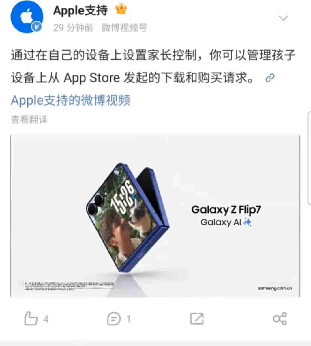 Yesterday, China’s official Apple support Weibo account posted about setting parental controls on your devices, but what caught the attention of many users was that along with the post, Apple shared a promotional video of Samsung’s latest Galaxy Z Flip 7 smartphone.