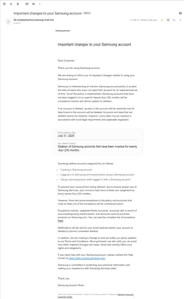[Update: The email officially belongs to Samsung and is not a scam]New phishing email related to deletion of Samsung accounts that have been inactive for 24 months circulate online