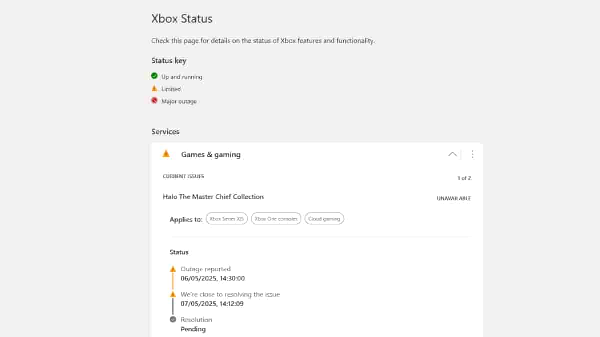 Halo: The Master Chief Collection and Halo Infinite are also listed as unavailable due to separate outages. Xbox teams are working on a resolution, but no ETA has been provided yet. These outages affect game launching across Xbox Series X|S, Xbox One, and Cloud Gaming platforms.