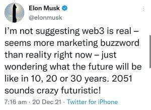 What Elon Musk is pointing towards is Web3, the future of the internet. It is still a growing form of the Internet that will incorporate decentralized sites or apps on the blockchain. Musk tweeted, “I’m not suggesting web3 is real – seems more marketing buzzword than reality right now – just wondering what the future will be like in 10, 20 or 30 years. 2051 sounds crazy futuristic!”