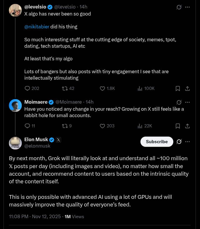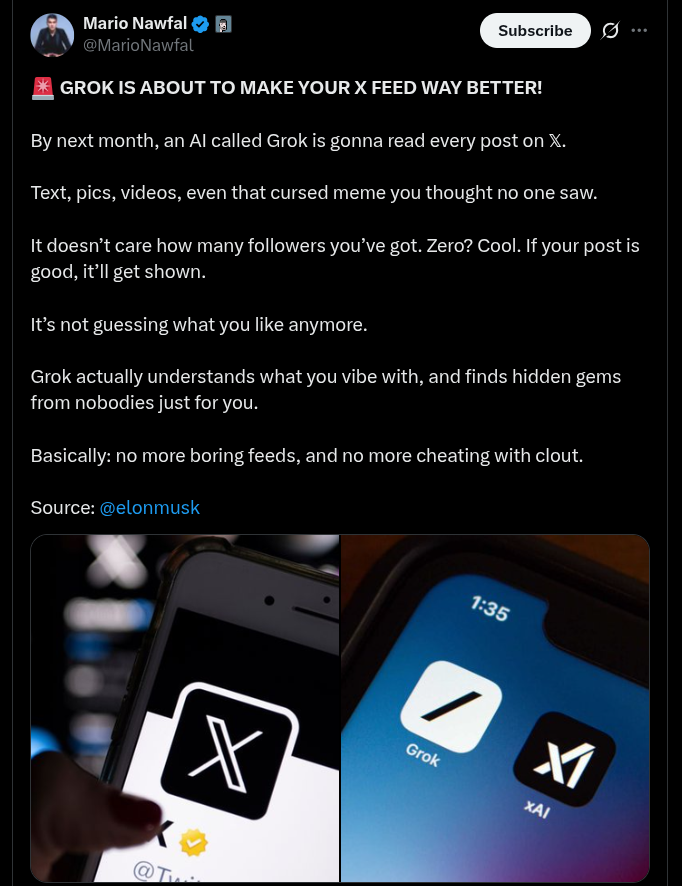 This update which came from Elon Musk himself on X (received via Mario Nawfal) reveals that by next month, Grok will start going through the 100 million posts that are usually shared on X on a daily basis, and by understanding them, it will start to deliver posts to users on their feeds based on the ‘intrinsic quality’ of the content. The announcement was made as a comment/reply to a user on X who had complained stating that ‘growing on X still feels like a rabbit hole for small accounts’. With this latest upgrade, even content from small creators having lesser number of followers will be able to attain good reach, solely based on the content quality of the post.