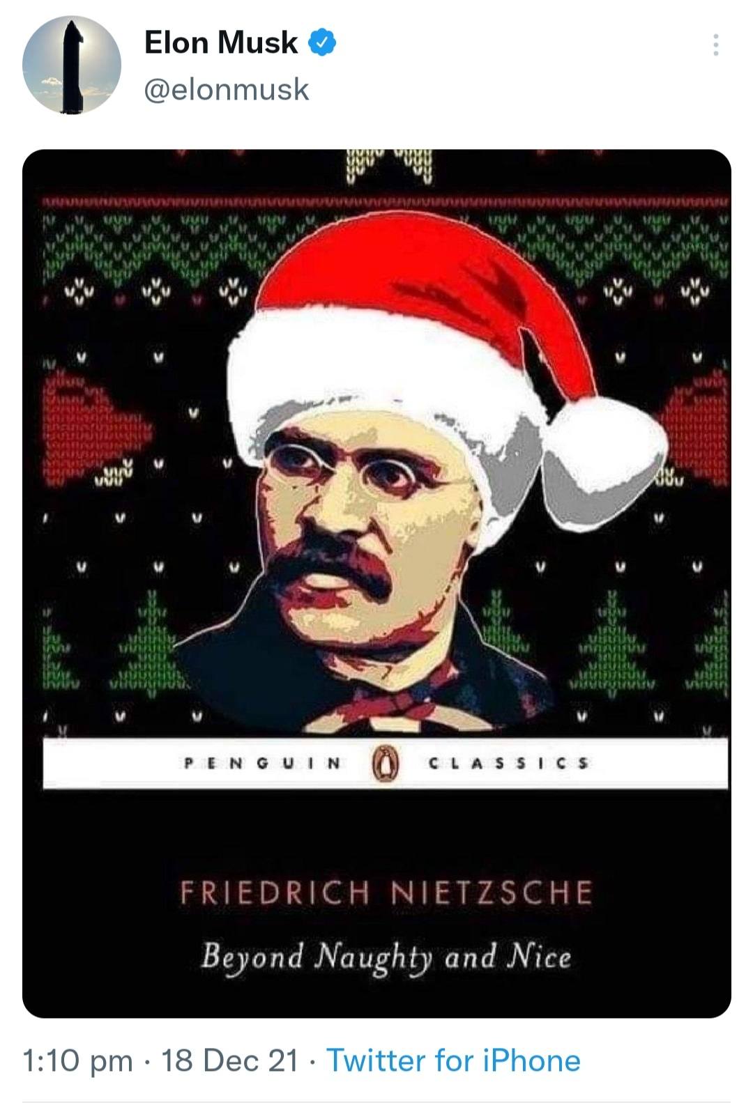 Is Elon Musk an atheist? Musk tweeted a picture of Friedrich Nietzsche wearing a Santa Cap!