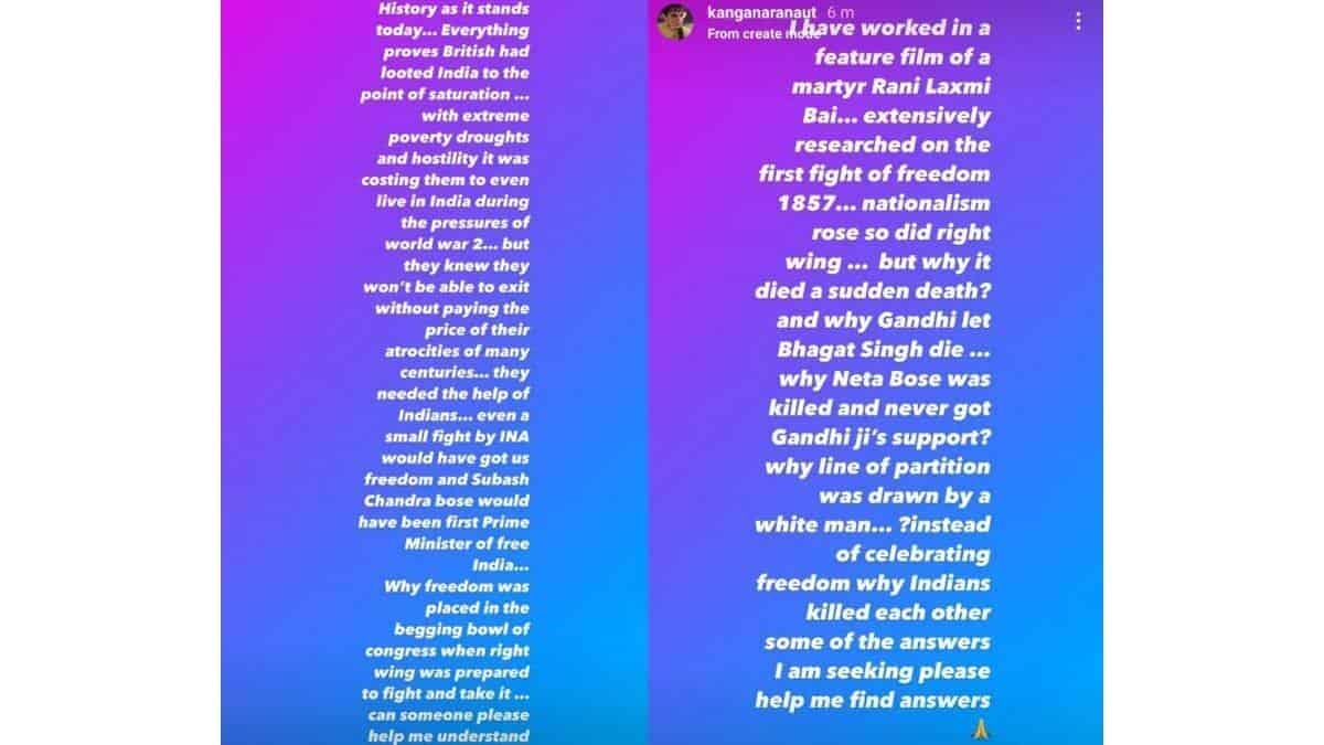 The actor used Instagram Stories to publish some chapters from a book that he wrote “simply to clear the air.” “Everything is very clearly described in the same interview 1857 first collective fight for freedom… along with greats like Subhash Chandra Bose, Rani Laxmibai, and Veer Savarkar ji’s sacrifice,” she wrote.