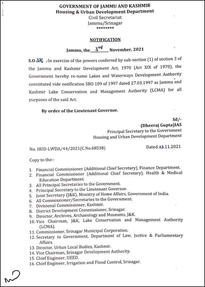 The Lakes and Waterways Development Authority (LAWDA) in Jammu and Kashmir was renamed Jammu and Kashmir Lake Conservation and Management Authority on November 3. (LCMA). “In exercise of the powers conferred by sub-section (1) of section 3 of the Jammu and Kashmir Development Act, 1970 (Act XIX of 1970), the Government hereby rename Lakes and Waterways Development Authority constituted vide notification SRO 109 of 1997 dated 27.03.1997 as Jammu and Kashmir Lake Conservation and Management Authority (LCMA) for all purposes of the said Act,” read the order issued by the Lieutenant Governor of the Union Territory.