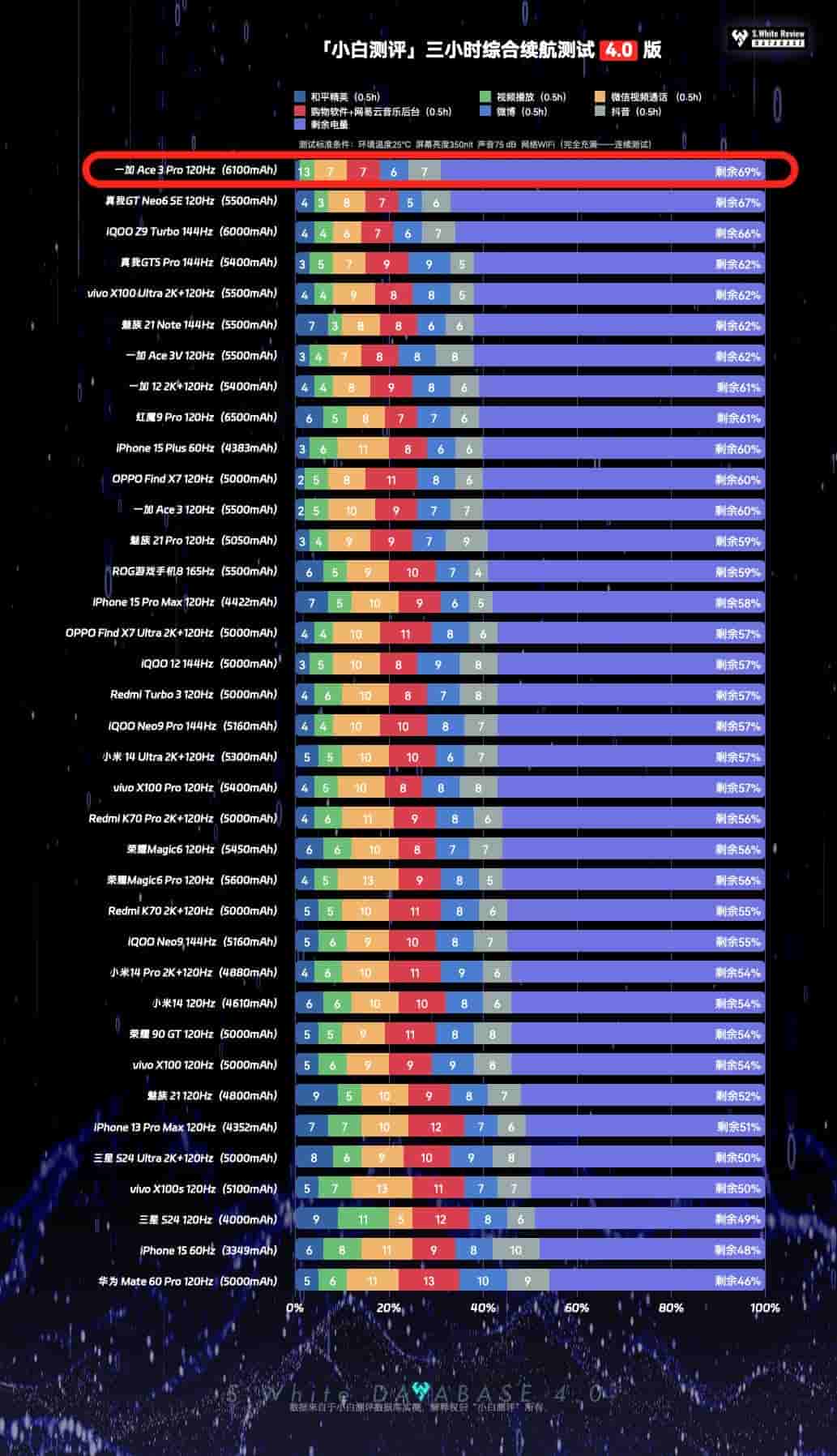 In the three-hour comprehensive battery life test it was revealed that 69% battery of the OnePlus Ace 3 Pro smartphone was remaining surpassing the other devices in the list. In the five-hour battery life ranking also, OnePlus Ace 3 Pro was in the first position with 74% battery remaining. While in the six-hour severe battery life test, the percentage of the battery reduced to 11%. According to the above listing, the total usage time of the smartphone is 6 hours 41 minutes, leaving the Red Magic 9 Pro with a 6500mAh battery, Honor Magic 6, Meizu 21 Note, OnePlus 12, and other smartphones behind.