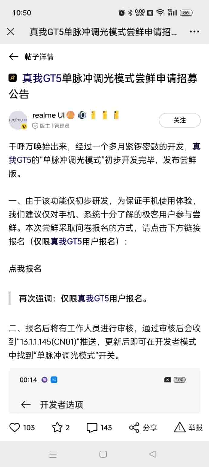 After completing the registration, there will be a staff review conducted by the company and the users passing that review will receive a 13.1.1.145 update on their Realme GT 5. After updating the device users can find the ‘Single Pulse Dimming Mode’ switch in the developer mode.