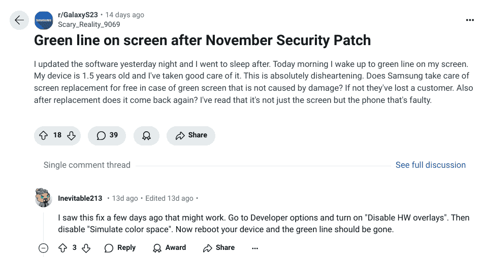 There is a hack proposed by a Reddit user, which seems to have worked for a Galaxy S23 user who faced the green line issue post the November 2024 security patch update. After enabling the Developer Mode, visit it and disable both ‘HW overlays’ and ‘Simulate color space’. Then reboot the device and the change can be found. While this hack wouldn’t solve the problem immediately, it does work as reported by the Galaxy S23 user.
