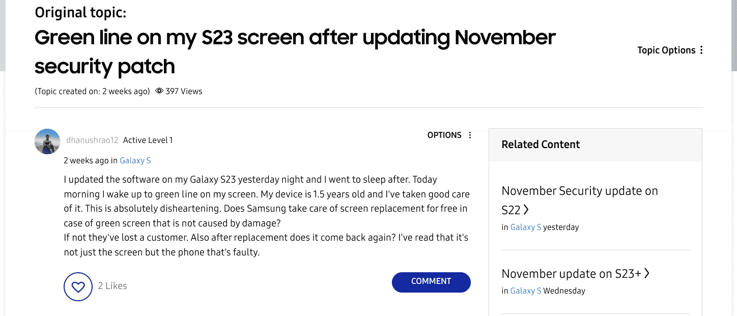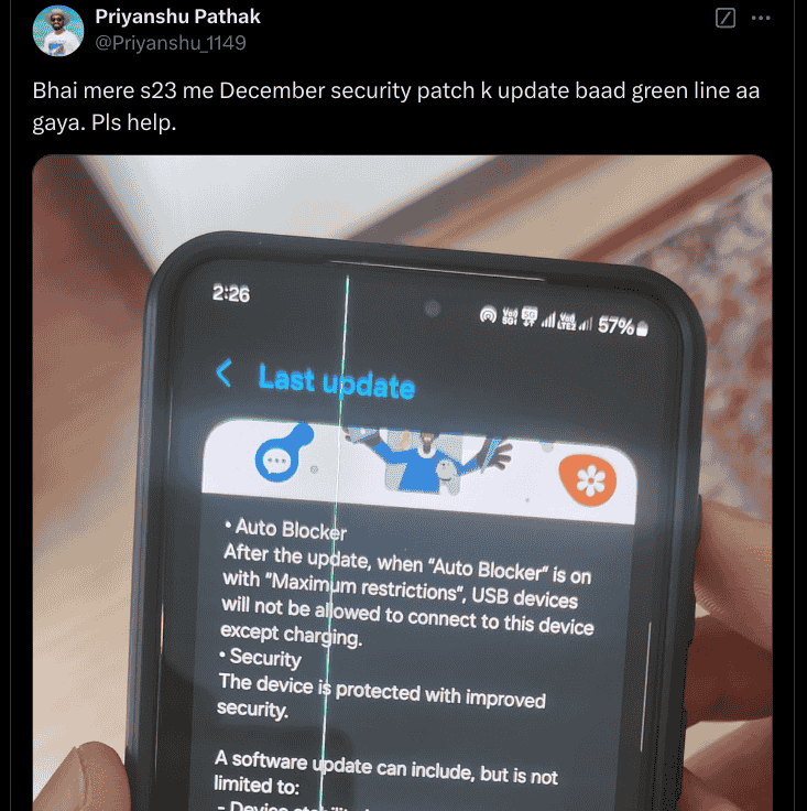 As per what is being reported by Galaxy S23 Indian users on Samsung’s community page and other social media platforms, it is following the November/December 2024 security patch update that the screen line issue has arrived and no kind of physical damage has happened to their respective devices. Even so, Galaxy S23 users in India are denied free screen replacement pointing out that this is not a common problem for the Galaxy smartphone model. However, already many have started complaining and posting how they are facing this issue even after taking good care of the device.