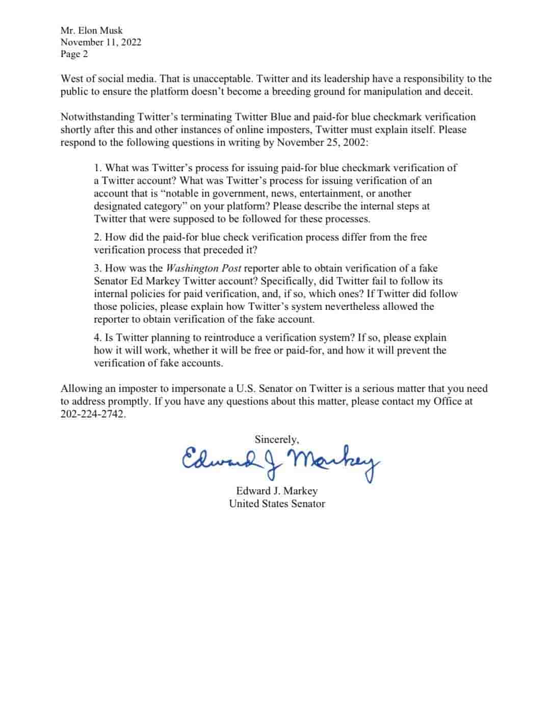 Since Musk acquired Twitter, a series of events has shaken it from the core. Users are expressing their anger and disbelief on Twitter but this time the US senator has sent a letter to Twitter to express his anger. The letter was written in the name of Twitter by US senator Edward J Markey. In this letter, he mentioned that a Washington Post reporter created a fake Twitter account by his name.