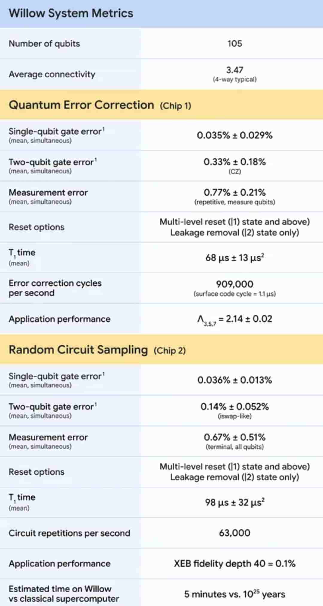 In an official blog post, the company has also mentioned that with 105 qubits, Willow has best-in-class performance across two system benchmarks: quantum error correction and random circuit sampling.