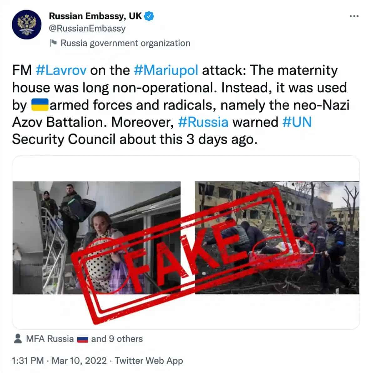 The Russian embassy tweeted out images of the bombing, including one of a pregnant woman hurt on the stairs, with the word “FAKE” written over the post.