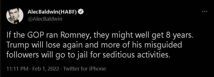 Alec Baldwin on Black History Month said a statement on Twitter that If the GOP ran Romney, they might well get 8 years. Trump will lose again and more of his misguided followers will go to jail for seditious activities.