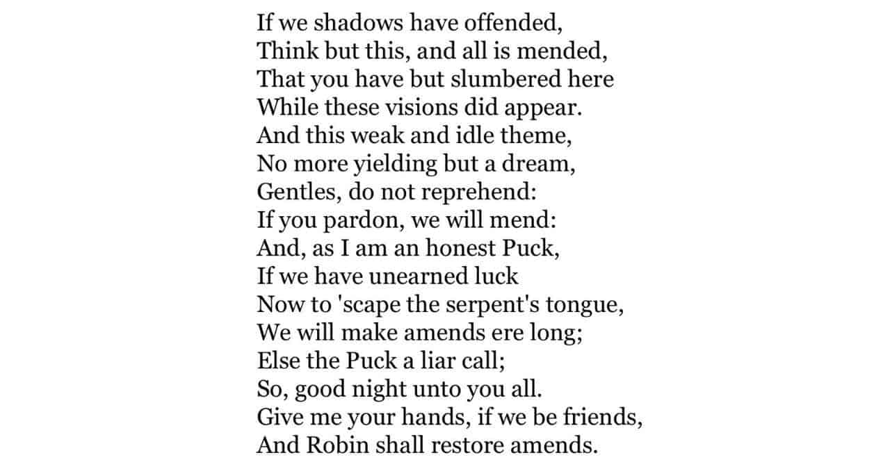 In that post, he shares if we shadows have offended Think but this, and all is mended, that you have but slumbered here while these visions did appear. And this weak and idle theme, No more yielding but a dream, Gentles, do not reprehend: And, as I am an honest Puck, if we have unearned luck Now to scape the serpent’s tongue, we will make the amends ere long; Else the Puck a liar call; so, good night unto you all. Give me your hands if we are friends and robin shall retear amends.