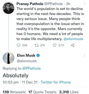 Pranay Pathole, a machine learning engineer of Tata Consultancy Services made a tweet today, “The world’s population is set to decline starting in the next few decades. This is very serious issue. Many people think that overpopulation is the issue when in reality it’s the opposite. Mars currently has 0 humans. We need a lot of people to make life multiplanetary” mentioning Elon Musk. The billionaire Elon Musk agreeing to him tweeted, “Absolutely.”