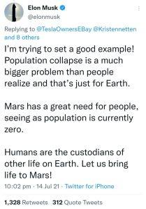 In July, he also tweeted, “Population collapse is a much bigger problem than people realize and that’s just for Earth. Mars has a great need for people seeing as population is currently zero, Humans are the custodians of other life on Earth. Let us bring life to Mars.”