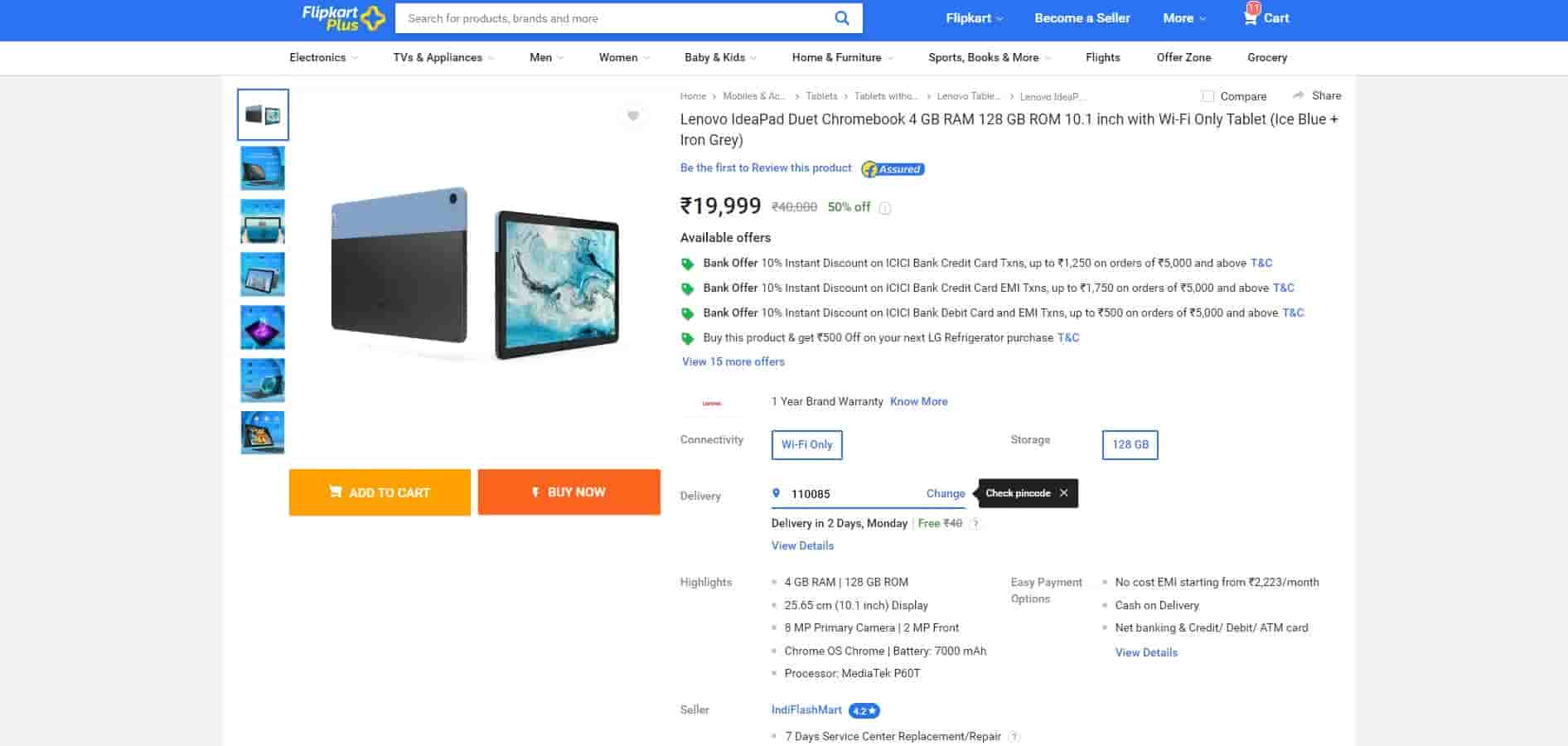 The Lenovo IdeaPad Duet Chromebook tablet is available to buy from Flipkart at 50% off of Rs 19,999 from the retail price of Rs 40,000. This tablet has a 4.2-star rating on Flipkart.