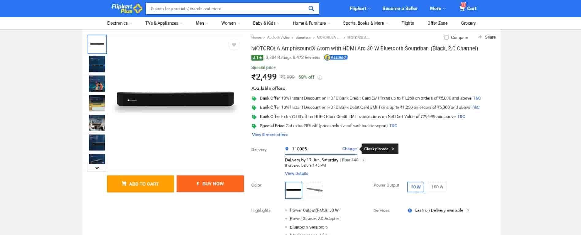 The Motorola AmphisoundX Atom Bluetooth Soundbar is available to buy at 58% off of Rs 2,499 from the retail price of Rs 5,999. This soundbar comes in black. This product has a 4.1-star rating on Flipkart.