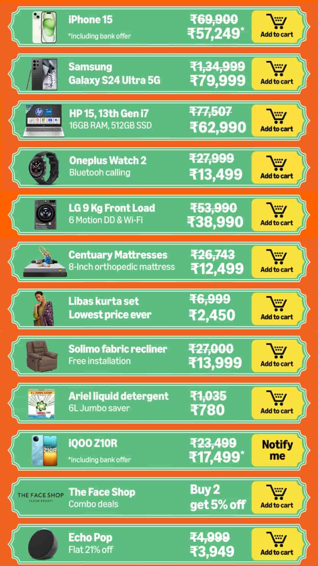 Consumers can enjoy a 10% instant discount with SBI Credit Card & EMI transactions, various exchange offers, No Cost EMI options, and some great deals. Top deals include- iPhone 15 at Rs 57,249, Galaxy S24 Ultra 5G at Rs 79,999, OnePlus Watch 2 at Rs 13,499,iQOO Z10R at Rs 17,499, and more.