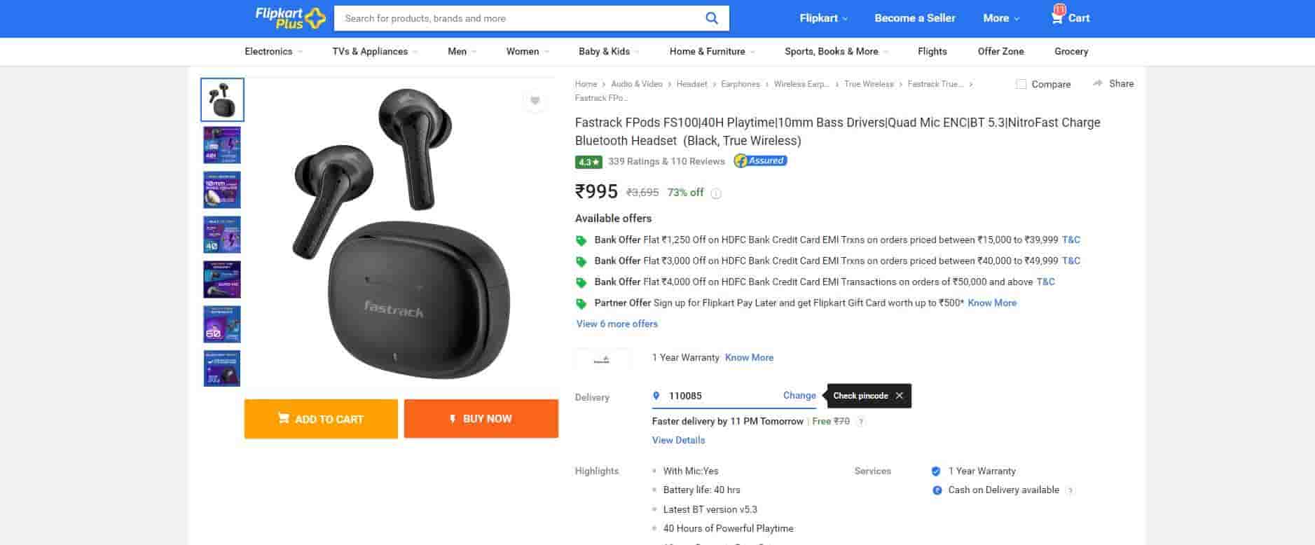 The Fastrack FPods FS100 earbuds are available on Flipkart at 73% off of Rs 995 from the retail price of Rs 3,695.