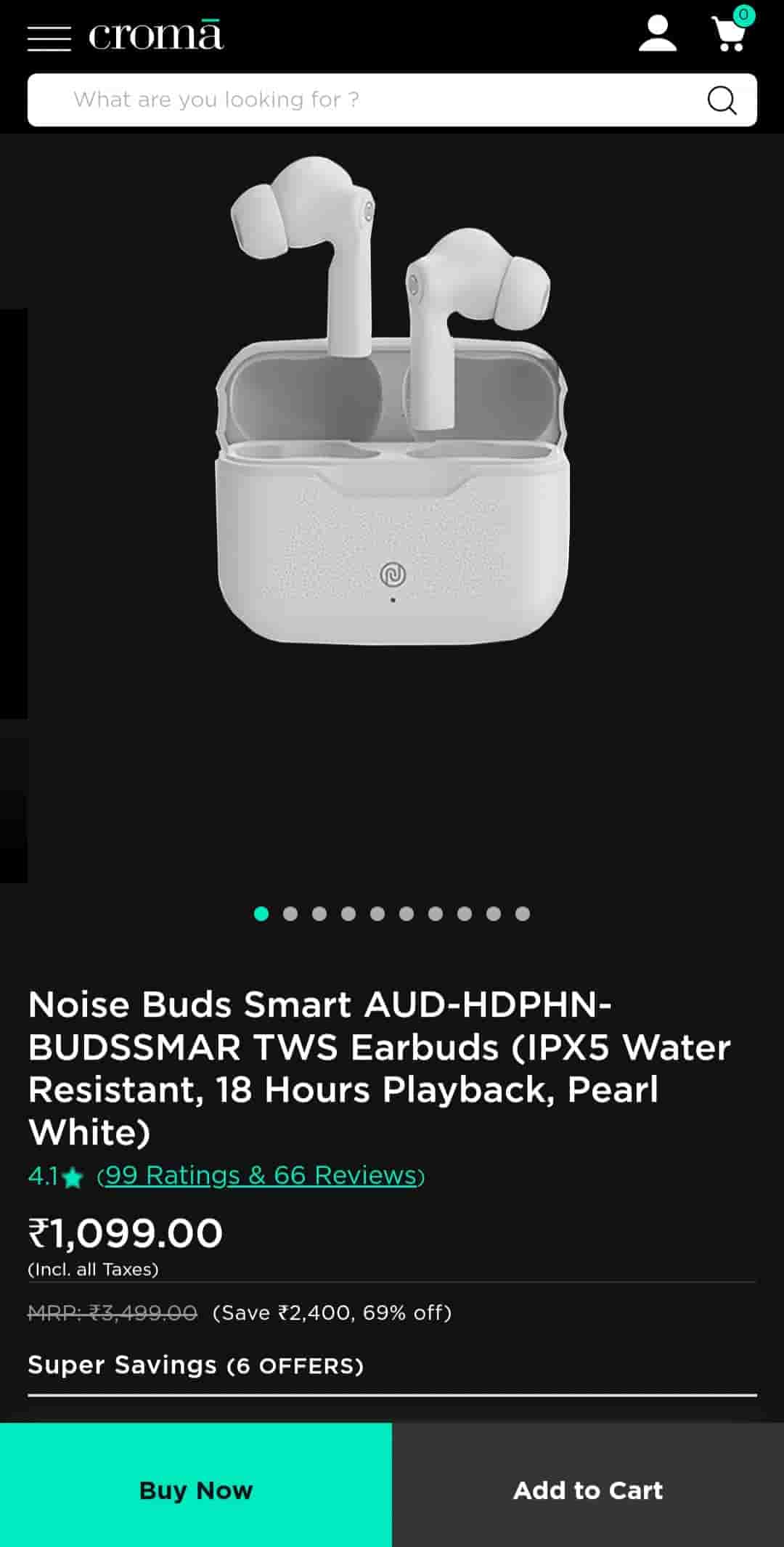 Noise Buds Smart TWS is available at a price of ₹1,099.00 with a massive discount of 69% off. The purchase saves you a sum of ₹2,400 as the previous price of the product was ₹3,499.00.