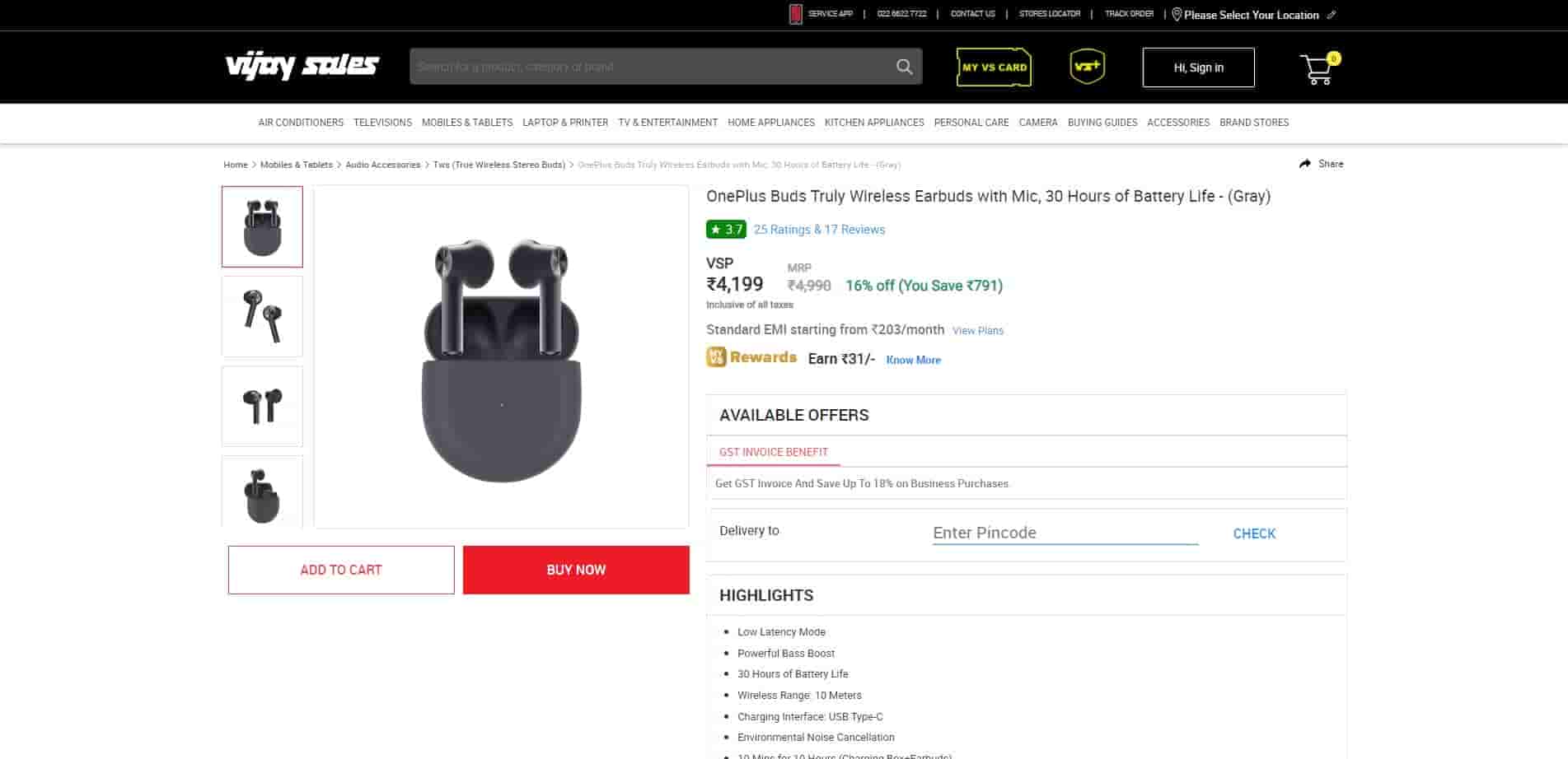 Looking for an earbud that delivers the best quality sound with long battery life here we have got something for you. OnePlus Buds Truly Wireless Earbuds are available on Vijay Sales at a 16% discount. This discount has brought down the price of earbuds from Rs 4,990 to Rs 4,199. It means you are saving Rs 971 on this deal. If you are looking for an EMI option that is also available that lets you grab it for just Rs 203 a month.