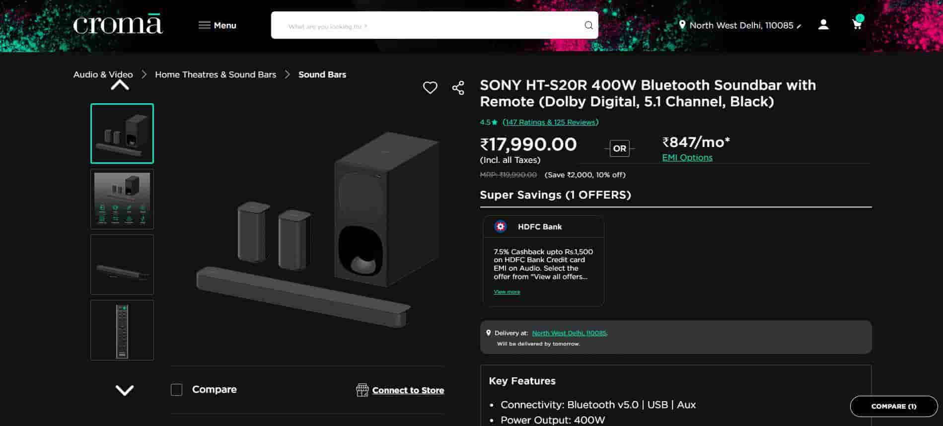 Don’t let low-quality sound systems ruin your party or weekend movie plan with your family and bring home a Sony HT S20R 400W Bluetooth Soundbar. This sound system by Sony is available on Croma at a 10% discount which means now you will have to pay only Rs 17,990 in place of Rs 19,990.