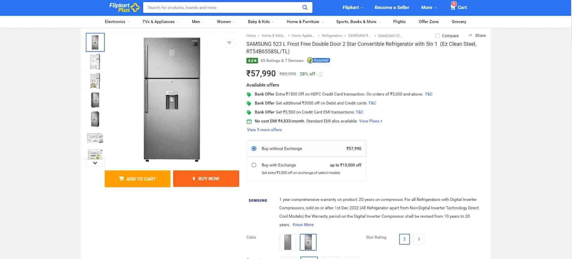 The SAMSUNG 523 L Frost Free Double Door 2 Star Convertible Refrigerator is now available on Flipkart at a 28% discount. It is available for Rs. 57,990, which is the second lowest price since its launch, compared to its retail price of Rs. 80,990.