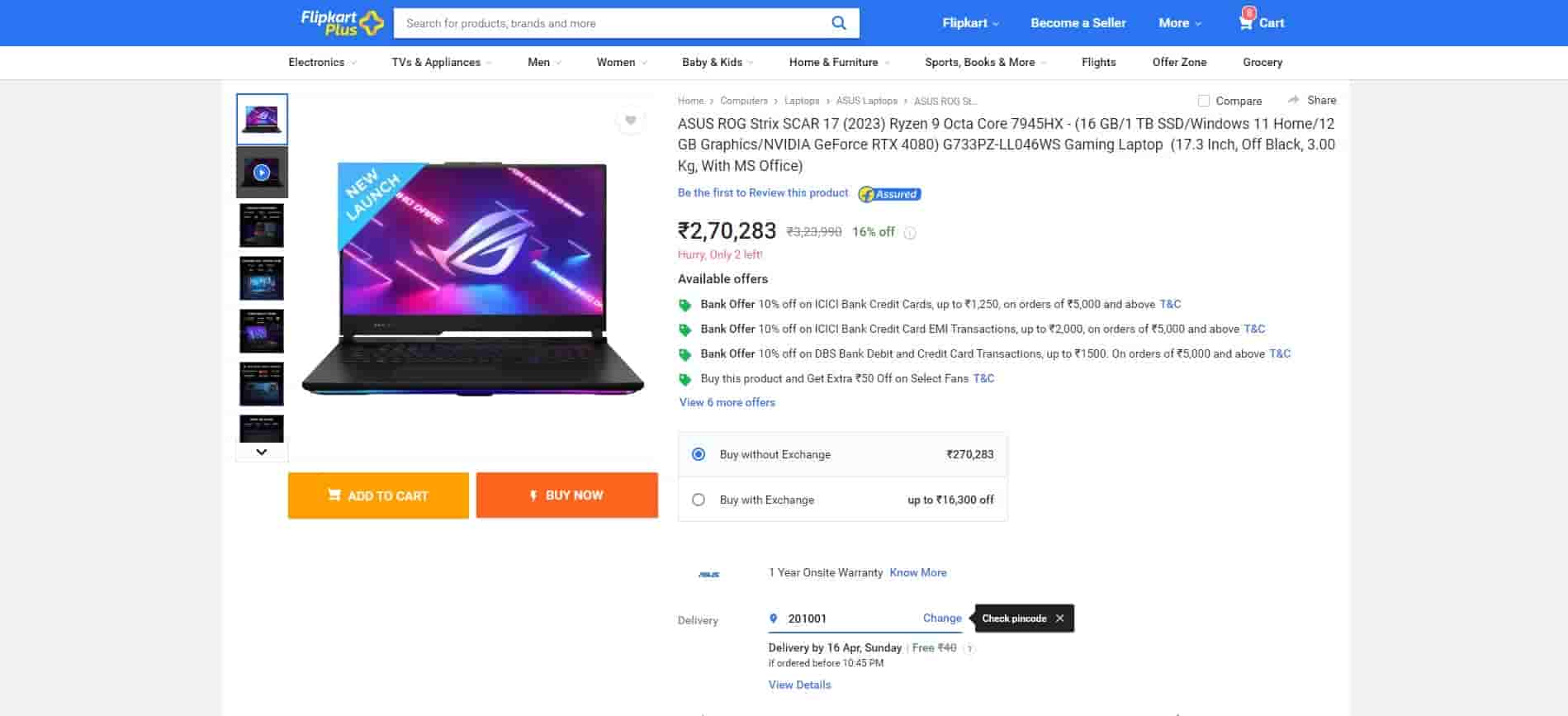 The ASUS ROG Strix SCAR 17 (2023) is available to buy at 16% off at Rs 2,70,283 from its retail price of Rs 3,23,990. This laptop has Off Black in color.