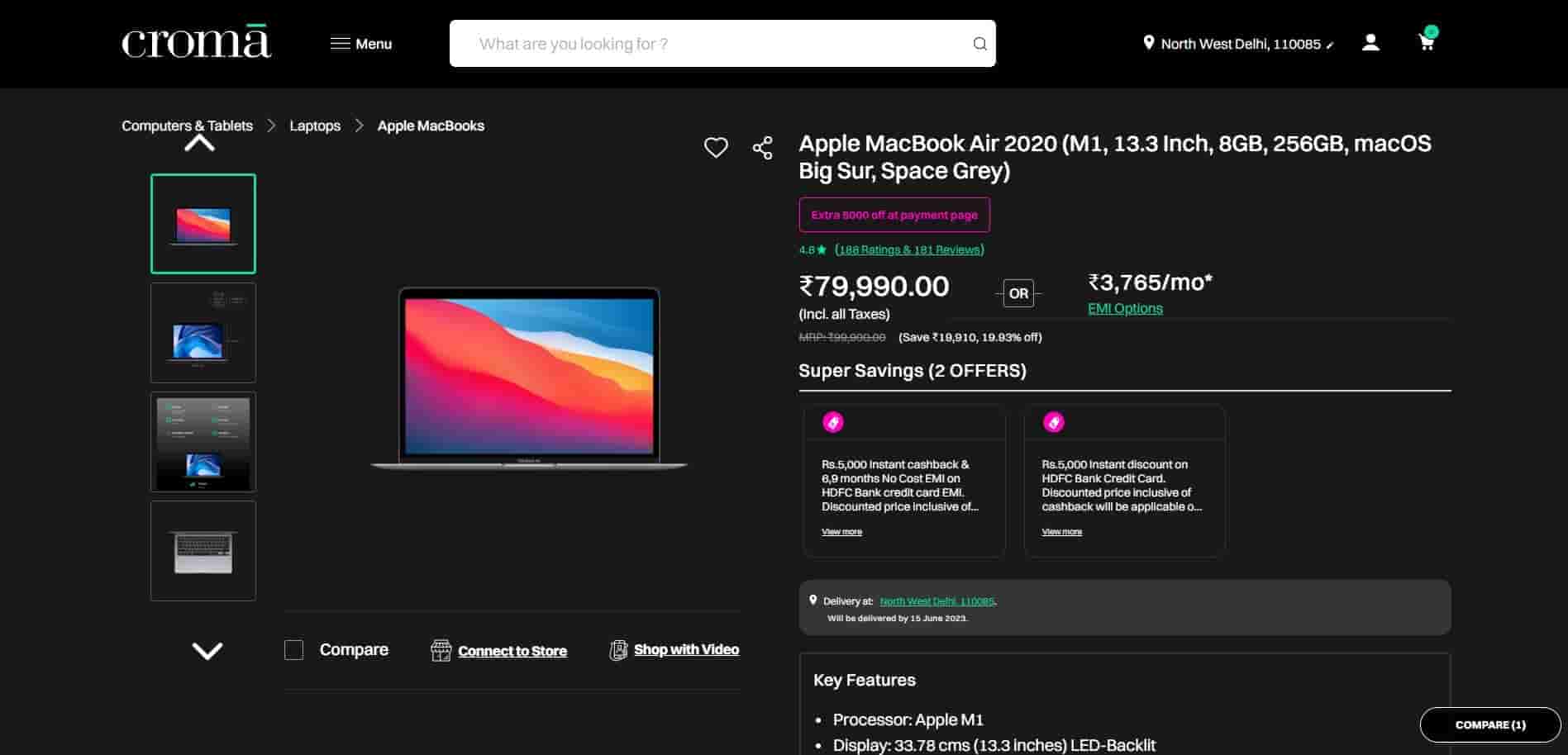 The Apple MacBook Air 2020 is available to buy from Croma at 79,990, which is 19% off the retail price of Rs 99,900. This MacBook comes in a Space Grey color.