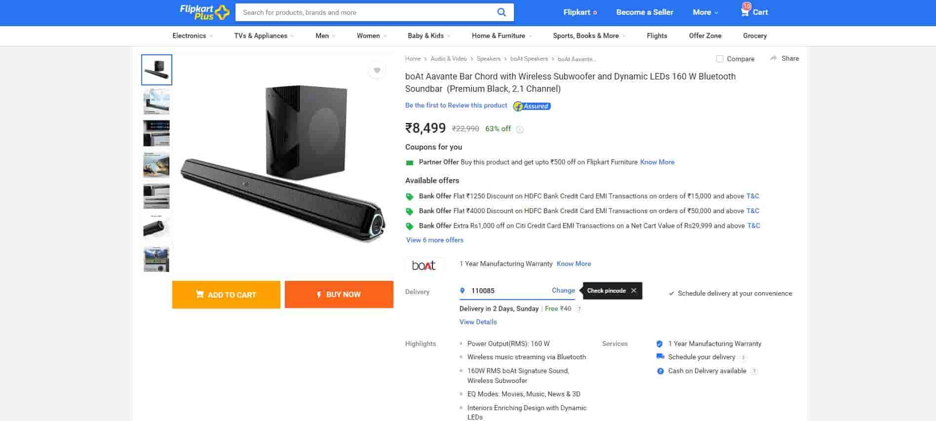 The boAt Aavante Bar Chord with Wireless Subwoofer and 160W Bluetooth Soundbar is available to buy from Flipkart at 63% off of Rs 8,499 from the retail price of Rs 22,990. The whole sound system comes in black.