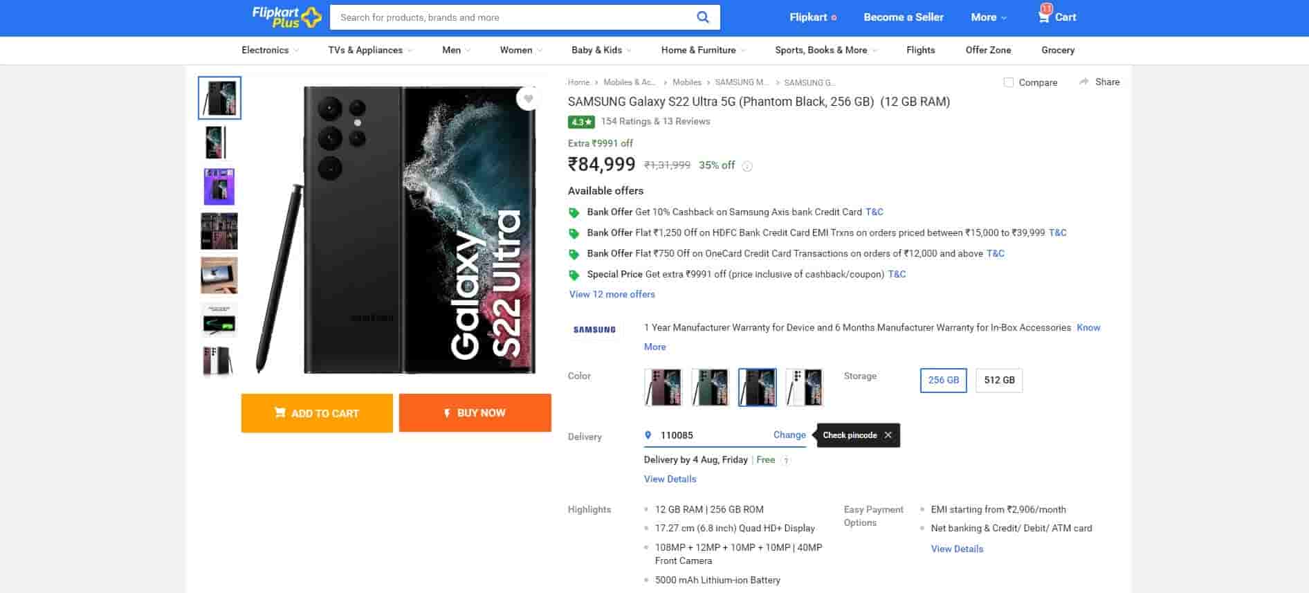 The Samsung Galaxy S22 Ultra 5G smartphone is available to buy from Flipkart at 35% off of Rs 84,999 from the retail price of Rs 1,31,999. This smartphone has a 4.3-star rating on Flipkart.