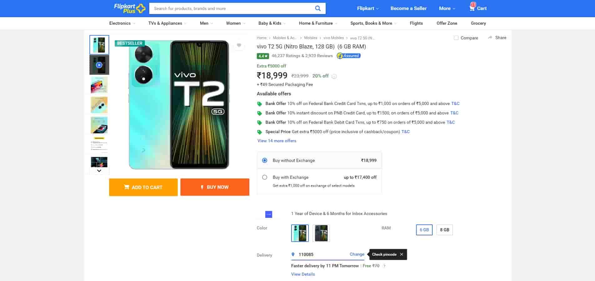 The Vivo T2 5G smartphone is available to buy from Flipkart at Rs 18,999, which is 20% off from the retail price of Rs 23,999. This smartphone has a 4.4-star rating on Flipkart.