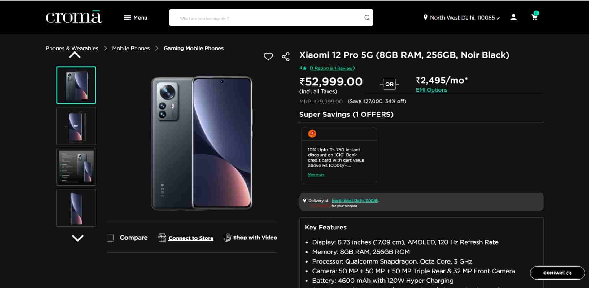 Xiaomi 12 Pro 5G 8GB am and 256 GB which originally cost you Rs. 79,999 after a massive discount on Croma is now available at just Rs. 52,999. This is actually going to save Rs. 27,000 for the consumers which indeed is a huge saving. Also if you want to go for the EMI facility you can avail of that along with this offer.