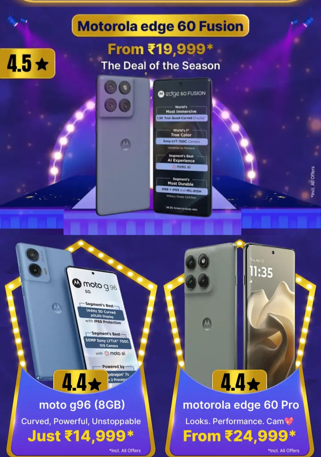 Motorola Edge 60 Fusion with the world’s most immersive 1.5K True Quad-Curved display, and the world’s first True Color Sony-LYT 700C camera will be available from Rs 19,999 (inclusive of all offers). Motorola G96 8GB variant will be available at just Rs 14,999 (inclusive of all offers), and Motorola Edge 60 Pro will be available from Rs 24,999 (inclusive of all offers).
