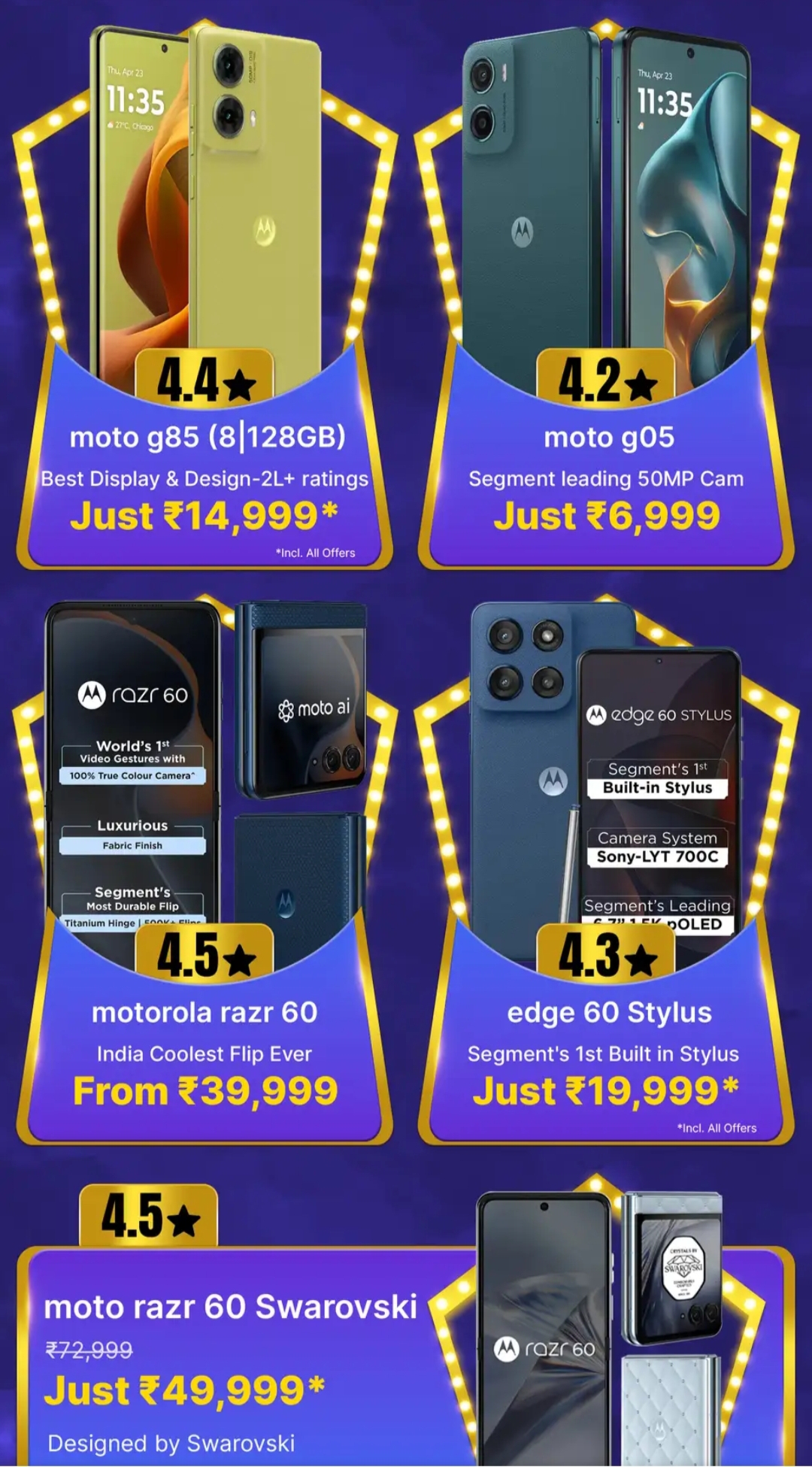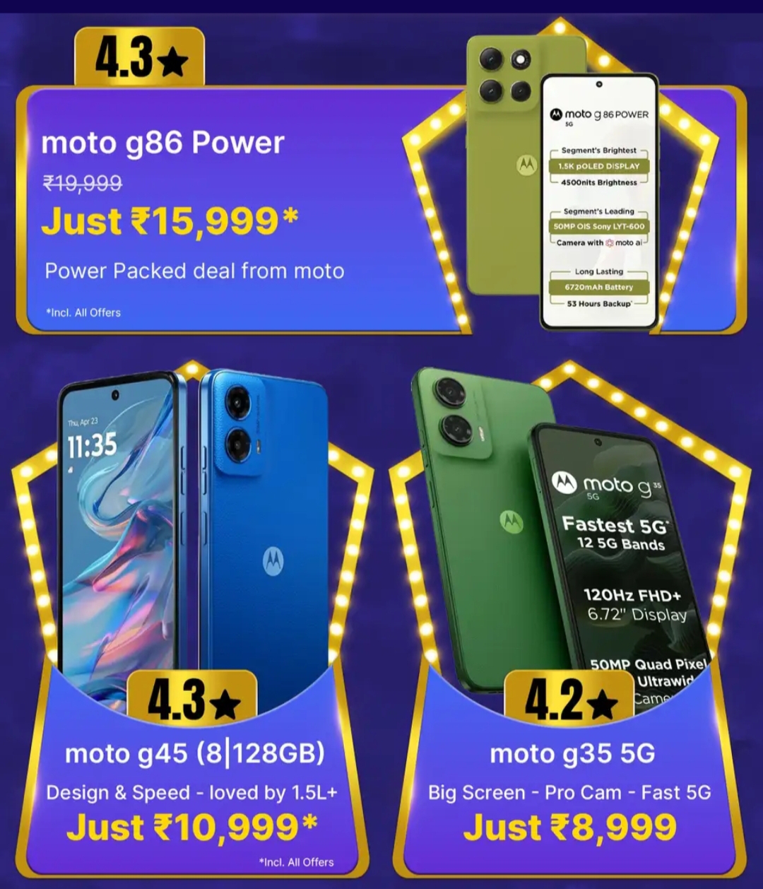 Motorola G86 Power with 50MP OIS Sony LYT-600 camera and 1.5K pOLED display will be available at just Rs 15,999 (inclusive of all offers). Motorola G45 8/128GB variant will be made available at just Rs 10,999 (inclusive of all offers), while Moto G35 5G will be available at just Rs 8,999(inclusive of all offers). Moto G85 8/128GB variant will be available at just Rs 14,999 (inclusive of all offers), Moto G05 at just Rs 6,999(inclusive of all offers), Motorola Razr 60 will be available from Rs 39,999 (inclusive of all offers), and Motorola Edge 60 Stylus will be available at just Rs 19,999 (inclusive of all offers).