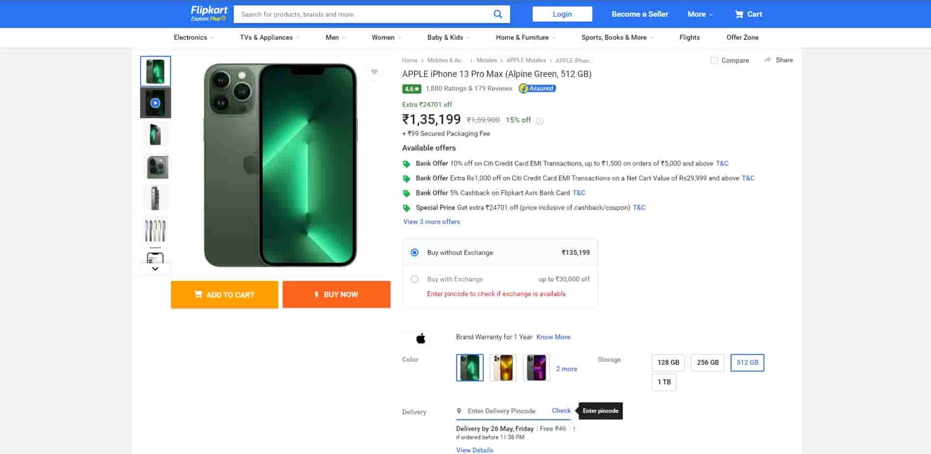 What if someone says that an Apple smartphone that is worth Rs 1,59,900 can be grabbed for as low as Rs 1,00,000? I know it sounds shocking but the iPhone 13 Pro Max is available on Flipkart at a 15% discount which has brought down the original price of the smartphone from Rs 1,59,900 to Rs 1,35,199.