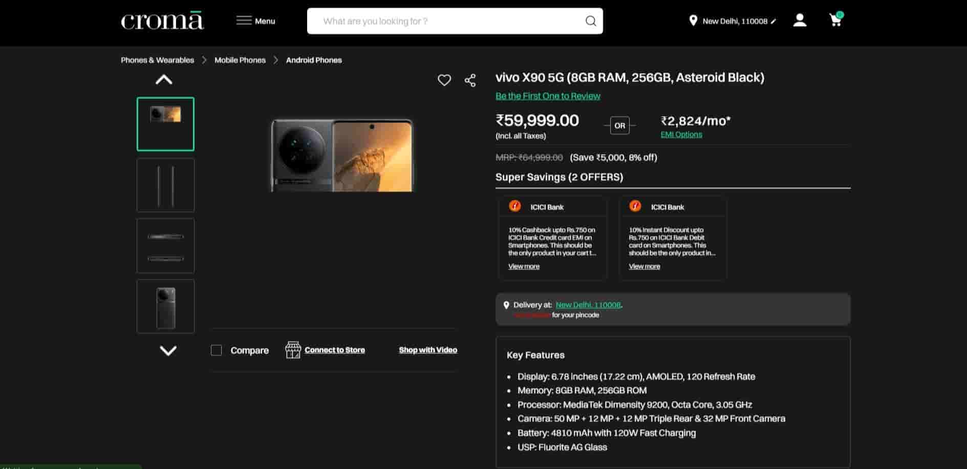 The Vivo X90 5G is available to buy from Croma at 8% off Rs 59,999 from the retail price of Rs 64,999.